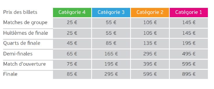 Il est clair que pour assister à la finale, il faudra quelque peu casser votre tirelire, même si avec des tarifs à partir de 85 € la place, cela reste raisonnable par rapport aux grands événements internationaux classiques (concerts, spectacles,etc.). Il sera même possible d’assister à de nombreux matches de groupe, et même à des huitièmes de finale, à partir de 25 €.